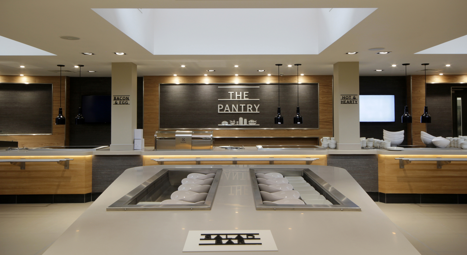 The servery – now known as The Pantry – has been extensively remodelled, removing walls and opening up this and adjoining spaces, creating far-reaching sight lines throughout. This has successfully created a diverse food court with a spacious, modern dining room – The Rossetti – that provides a central hub where staff and students can eat, drink and socialise with friends.