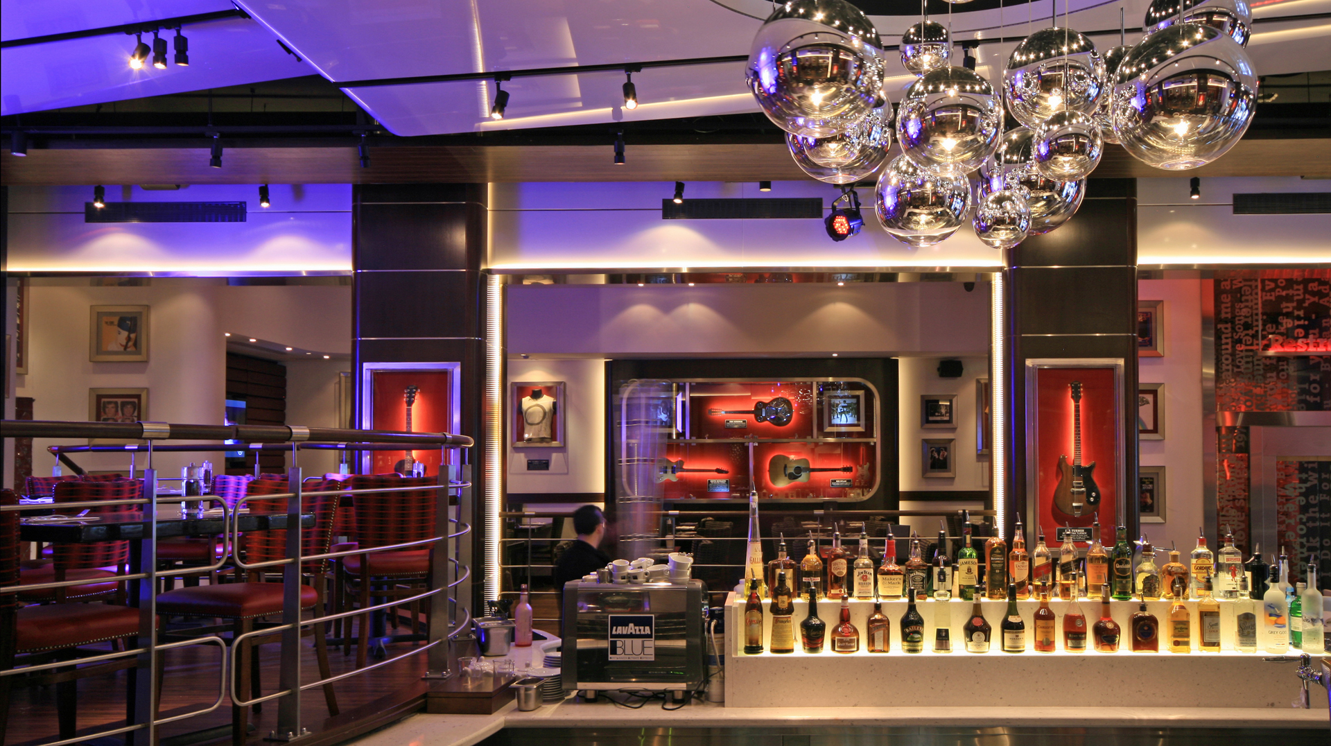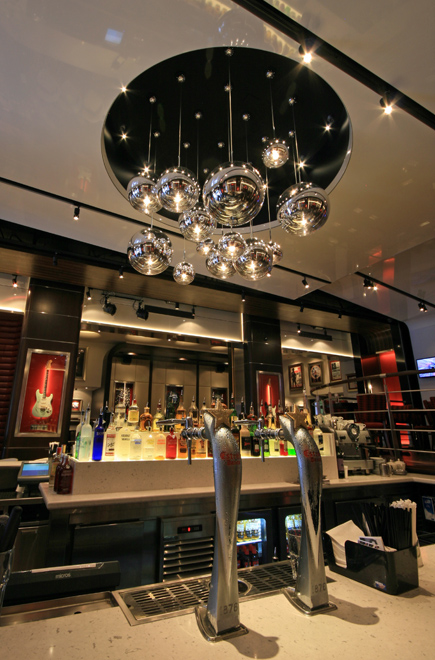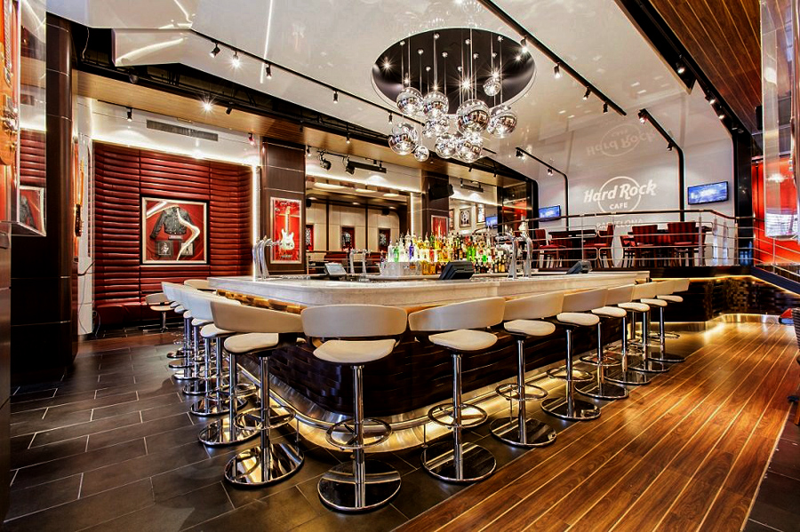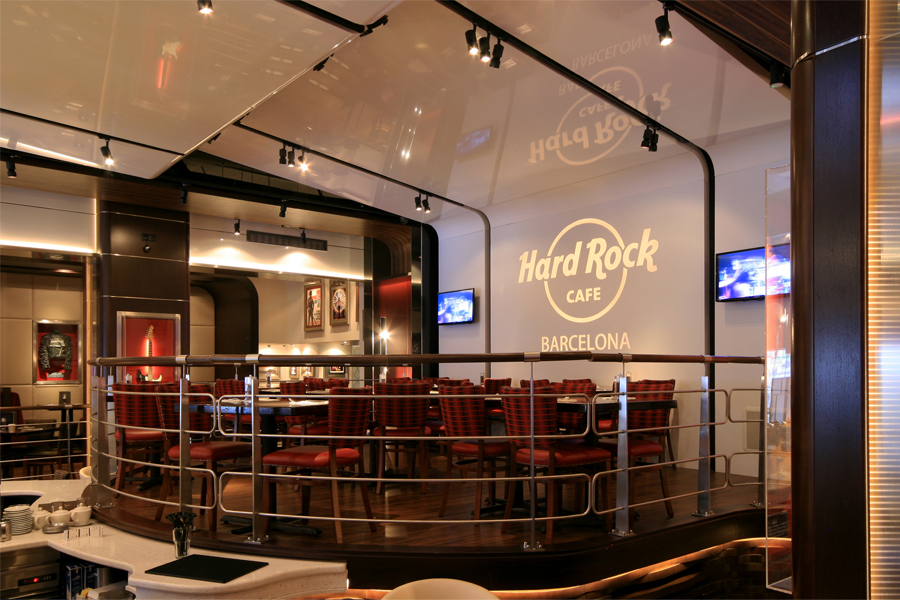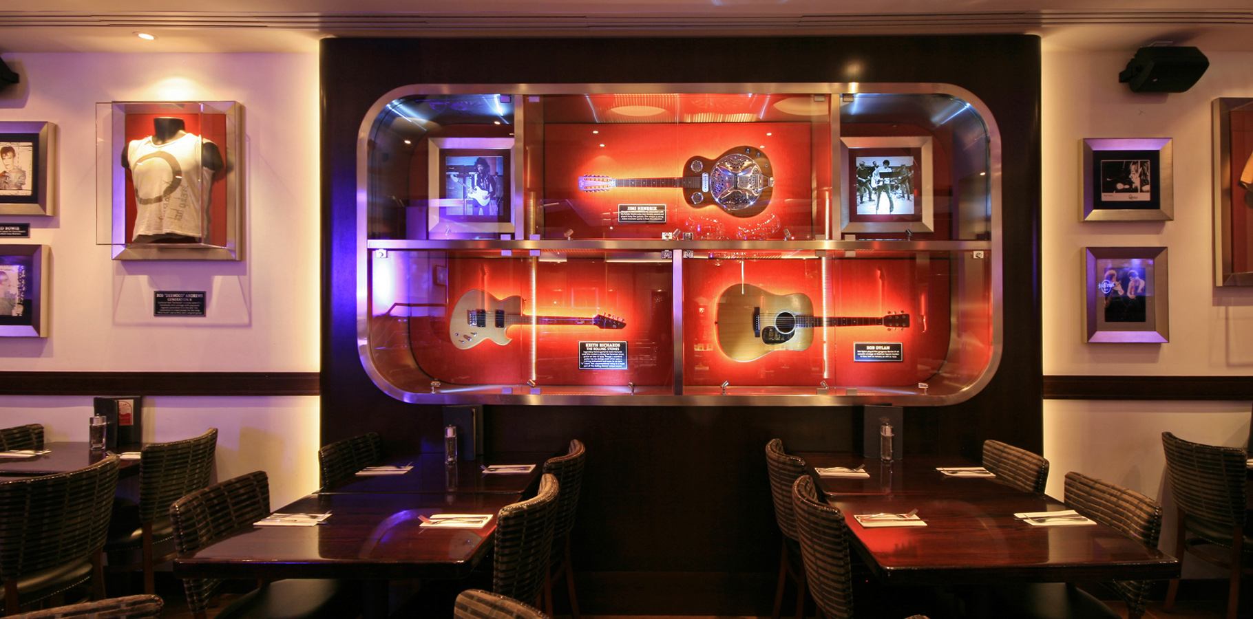 Gone is the flying Cadillac which once dominated the cafe and so is the old dark wood and brass interior which was once so typical of the early Hard Rock venues around the world. It has been replaced by a radically new and contemporary interpretation but it is still 100% Hard Rock from end to end. Memorabilia display has been transformed with built-in, museum standard cabinets throughout the venue. Memorabilia lighting by our design partners, Techical Arts, includes new LED tape lighting on the back of the guitar necks such that the priceless instruments apear to ‘float’ in their cases. In fact, the memorabilia is all new and now includes instruments and clothing from Michael Jackson, Bruce Springsteen, Keith Richards and Madonna to name but a few.