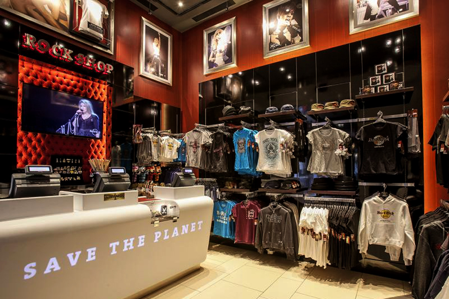 Red is also dominant in the two Rock Shops which frame the main entrance from the Placa Catalunya. These are amongst the busiest Rock Shops in the world and get extremely crowded in high season. Consequently, these have been completely remodeled to improve access to merchandise. New POS counters built entirely of white ‘Corian’ have been designed for the project which incorporate the Hard Rock ‘mantras’ – “Love All, Serve All” and “all is One”. The words are routed into the rear face of the counter-front Corian and then back-lit with warm white LED. When illuminated, the words appear on the counter fronts. When the lighting is off, the words completely disappear.