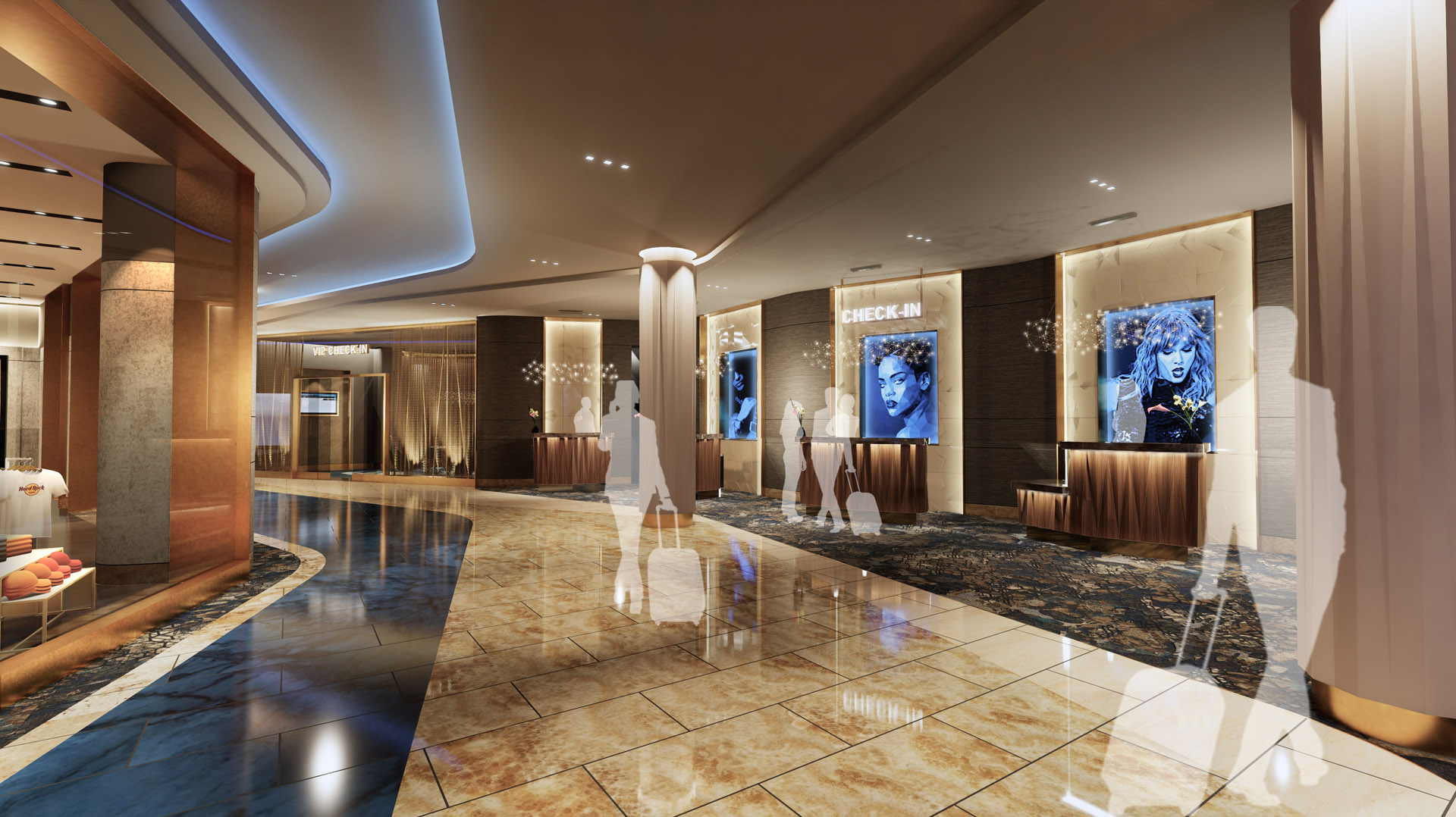 The centrally located Lobby bar (below) sits on the edge of a three-storey atrium extending into the convention areas below. A substantial rooflight allows daylight to penetrate all the way to the lowest basement levels. As a backdrop, the enormous 17m high, 500sqm wall will feature a huge sound wave, made from Krion fins. These rise from the second basement to the lobby ceiling and twist to make the wave – music turnede into sculpture. Within the wave, hundreds of concealed LED strips create a colossal ‘graphic equalizer’ that, at night, will respond to the music in the lobby and bring the wall to life.