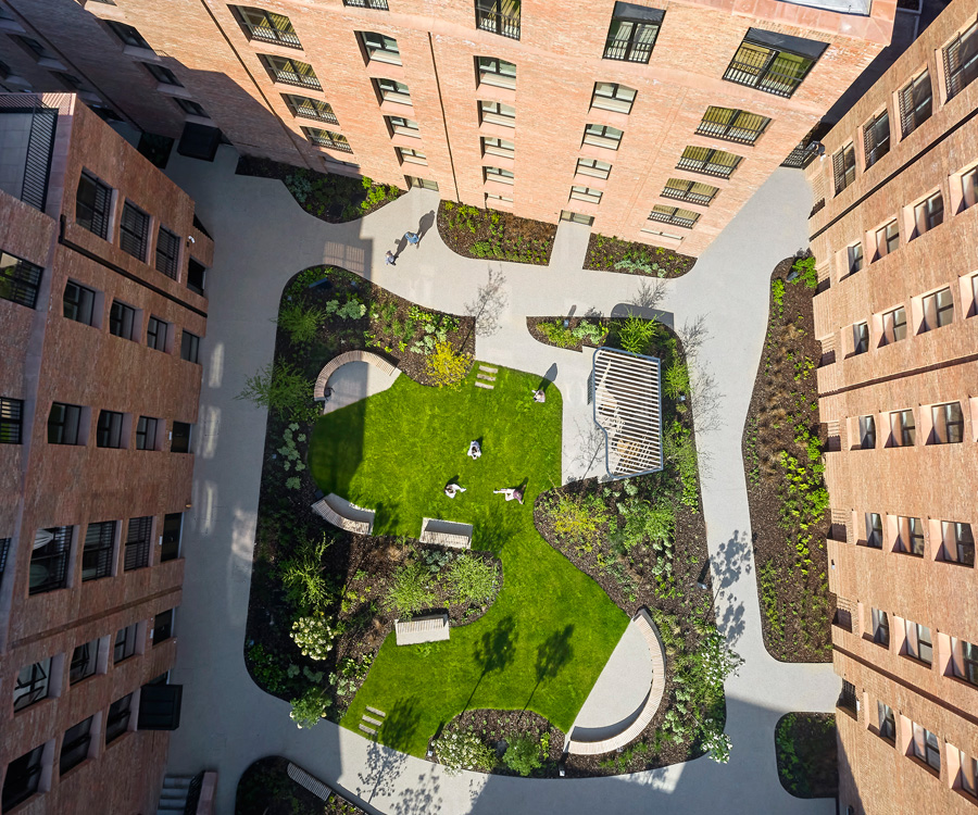 Central to this place-making approach is the residents’ fully landscaped courtyard, providing the apartment dwellers with valuable external amenity space and secure access to each of the residential buildings. The courtyard includes a gazebo with power and lighting, which residents can use when working (or playing!) from home.