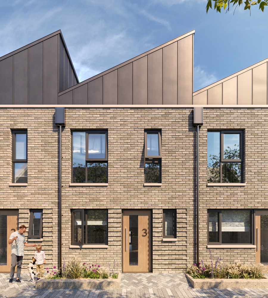 This scheme will provide 32 high quality residential homes designed around a shared ‘garden street’. This green space will provide the residents an opportunity to relax, play and interact socially with their new community. All the homes have individual gardens and parking spaces with electric charging points. The homes are grouped together in a series of terraces with the majority being designed as two storeys apart from one central terrace which is designed over three floors.