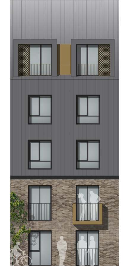 The other significant design move is the 50 / 50 split of material which is a very strong architectural language of this part of the UK. The ground and first floor are clad in brickwork, whilst the upper floors and roof are clad in metal standing seam.