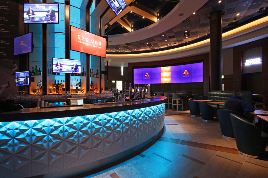 Nearly 5 years, over 300 Fuse drawings and over 25,000 emails later, the new venue was unveiled to the public in January 2017. Staying with the statistics, the casino which is the size of 18 tennis courts cost £30m to turn into a reality and the casino has created more than 200 jobs in the Leeds City Region. It boasts 24 gaming tables, 140 slots, 80 electronic gaming terminals and a 100 seat dedicated poker area – plus two spectacular bars and a restaurant. 432,000 bronze beads were used in the canopies over the gaming pits and 1.9km of carpet cover most of the floor (that’s around 8 tonnes) with about 50km of data cable concealed beneath it. There are 102 TV screens, of which 21 make up a huge video wall to show major sporting events.