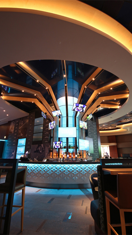 The casino sits at second floor over the retail arcades below and is actually arranged over three levels. This posed a huge challenge for the design team as casinos generally consist of a single flat floor. The philosophy was therefore to turn this disadvantage into a virtue and use the levels to create smaller, intimate zones such that the very large venue never feels very large to the customers using it. Another issue with gaming floors is that the slots and tables (and the customers) tend to block low level views so new visitors can struggle to understand the layout of the space. Here, the ceilings have been used to provide clues (a device known as ‘cognitive mapping’). The gaming floor ceilings therefore have a curvaceous edge which tells the visitor where the space continues around the corner – encouraging exploration and distribution of people around the casino.