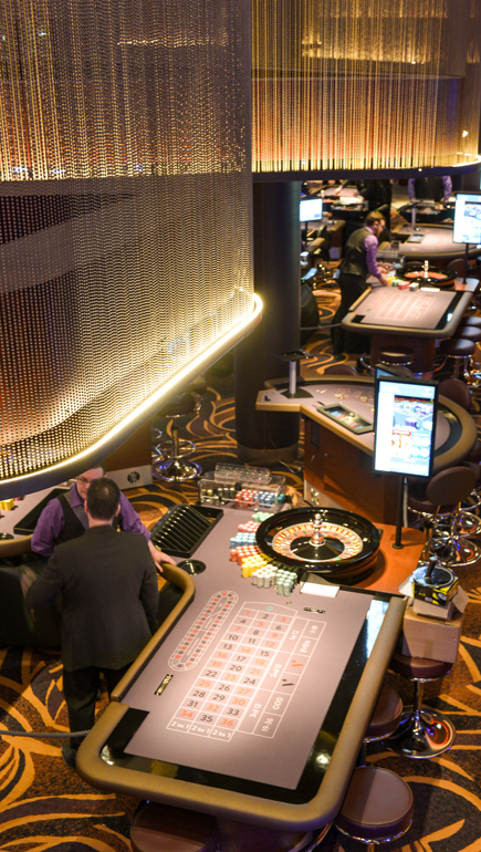 Another significant challenge was the height of the space. We wanted to maintain as much height as possible to make the casino as dramatic as it could be but we also had to deal with the need to provide lighting and cameras at low level over the gaming tables. The solution was the innovative pit canopies – hardwood-clad triangles that ‘float’ over the gaming tables with interchangeable panels on the underside containing speakers, lights and cameras. To reduce the impression of their weight, curtains of illuminated bronze beads encase them and extend upwards towards the ceiling, making them appear more delicate and at the same time creating a sense of intimacy at the tables below – despite the considerable true height of the room.