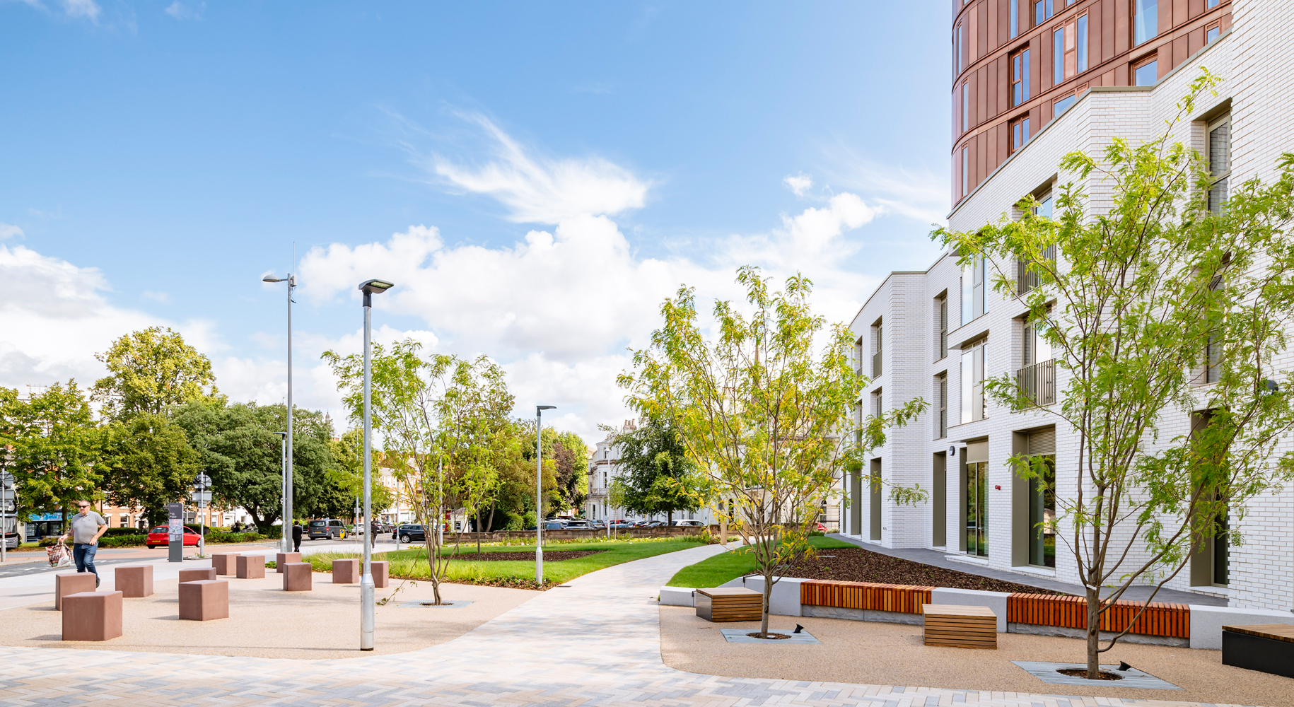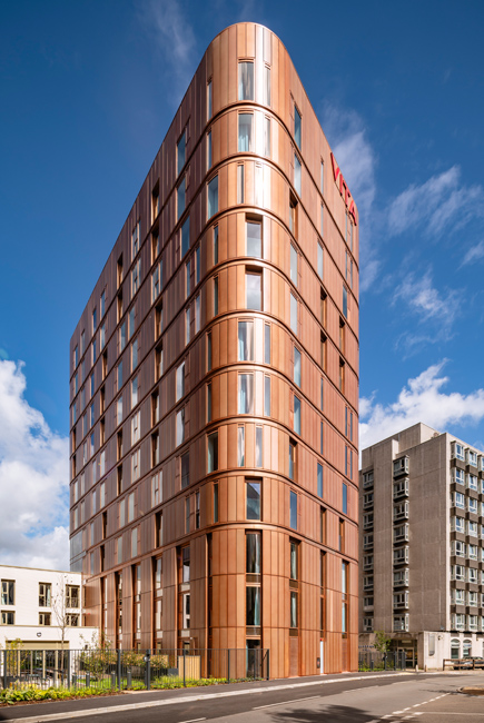 In contrast to the more traditional three storey brickwork podium, the residential towers are clad in an aluminium rainscreen system, with a unique copper coloured translucent paint finish, which was selected to complement and reflect the local building materials, whilst providing a natural variance in colour across the façades.