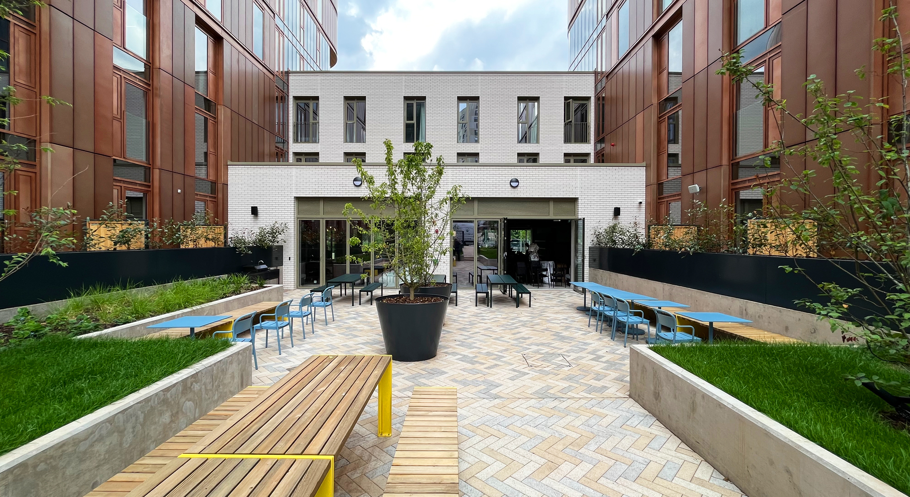 The accommodation is split across three main building elements, a 3-storey white brickwork podium, and two metal rain screen clad towers at 12 and 14 storeys. External amenity is provided through access to two external landscape terraces and a central landscaped courtyard, complete with external kitchen facilities.