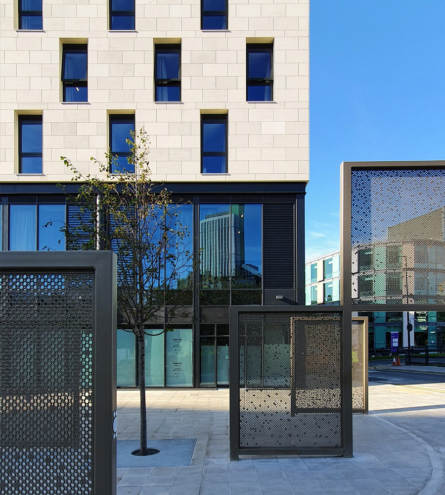 Due to the size of the building, including the height of the tower element, the design team tested the proposed scheme in a wind tunnel in order to assess the potential impact on the microclimate. Following a rigorous testing procedure, in order to enhance pedestrian comfort, decorative wind baffles have been integrated within newly landscaped areas.
