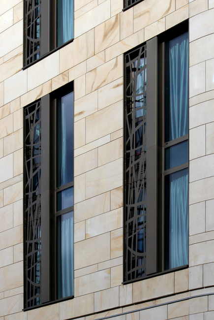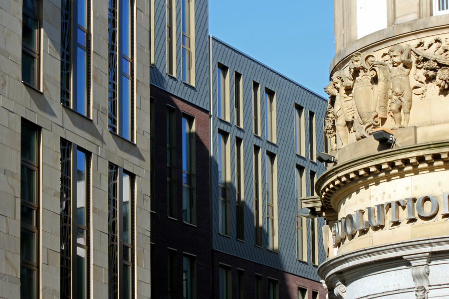 At the upper level zinc shingles have been used to clad the top floors and roof of the building: the mansard building form and materiality again responding to its neighbours. High quality anodised aluminium window framing and feature screens were used for the building’s principle facades.