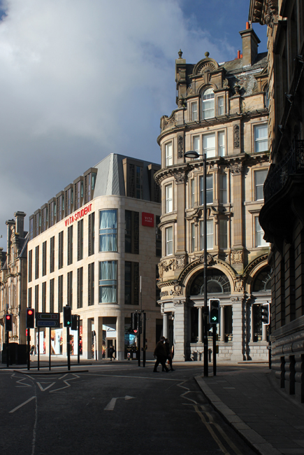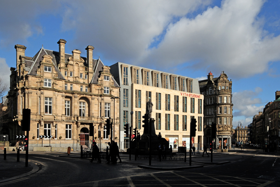 Design cues were taking from the surrounding buildings in terms of building heights, window proportions, façade rhythm and materials. In addition a great deal of attention was paid as to how the building “turned” the prominent junction between Westgate Road and Pudding Chare, resulting in the very large curved glass windows that are a major feature of the completed building – and offer some stunning city views for some of the residents!