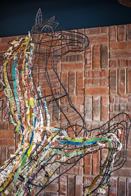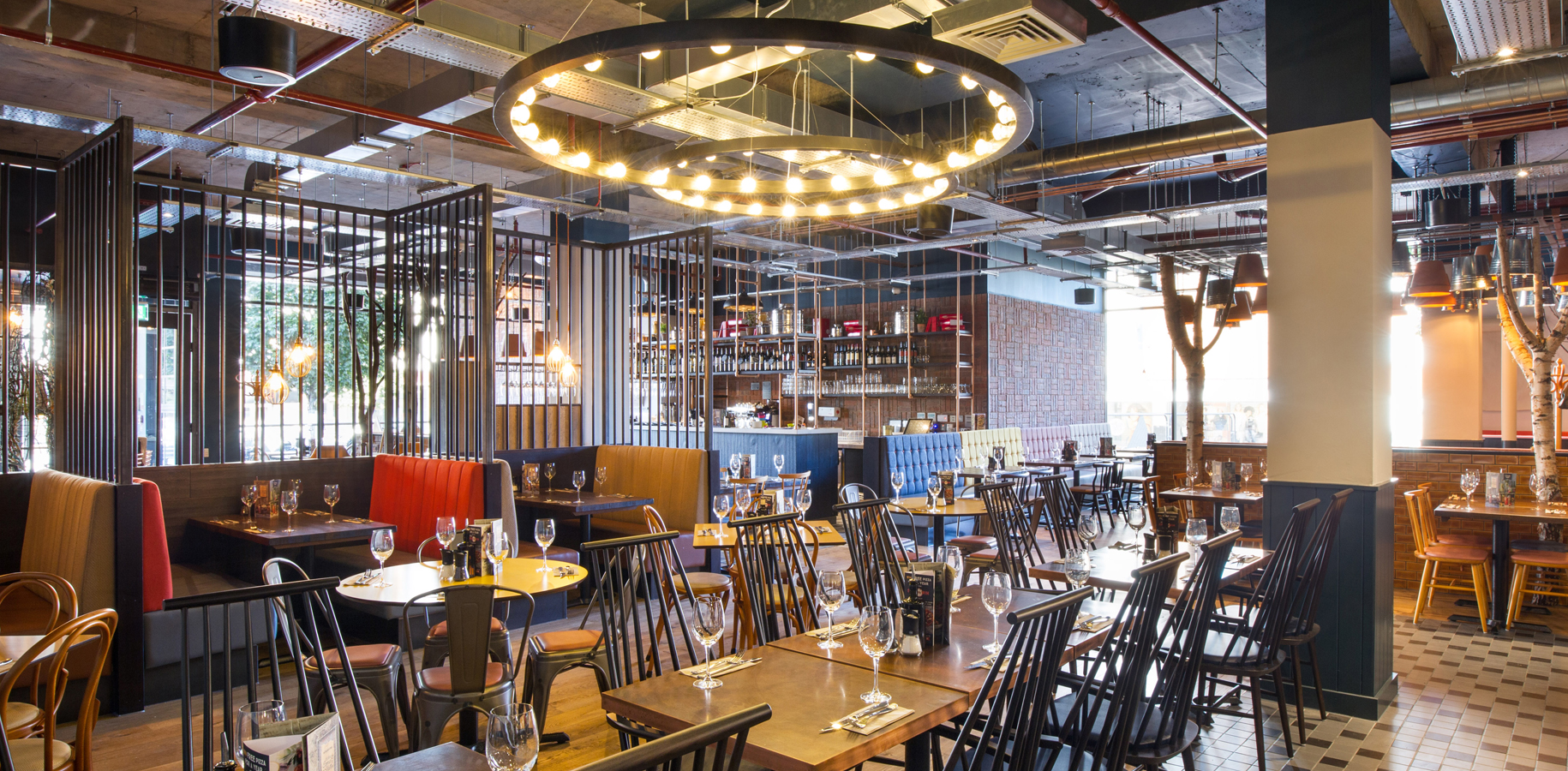 Located at the Cathedral Lanes Shopping Centre. Zizzi Coventry provides the perfect place to have a coffee or lunch whilst shopping. The restaurant interior takes inspiration from a legend dating back at least to the 13th century, in which Lady Godiva rode naked—covered only in her long hair—through the streets of Coventry to gain a remission of the oppressive taxation that her husband, Leofric, imposed on his tenants. A bespoke sculpture of a horse formed from thick steel wire stands proud in the entrance area whilst large circular lighting features are reminiscent of cartwheels. The remaining interior provides a warm and eclectic backdrop in which to dine